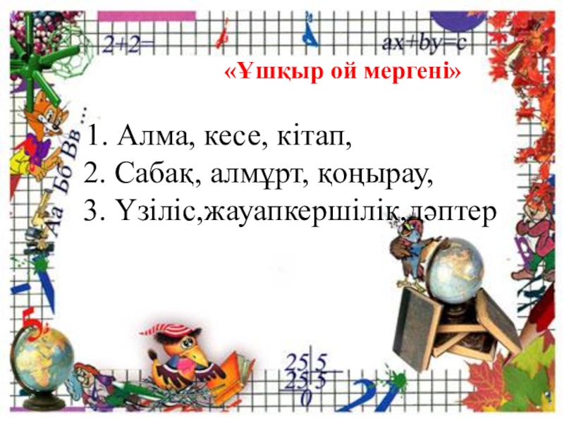 «Ұшқыр ой мергені»  1. Алма, кесе, кітап, 2. Сабақ, алмұрт, қоңырау, 3. Үзіліс,жауапкершілік,дәптер
