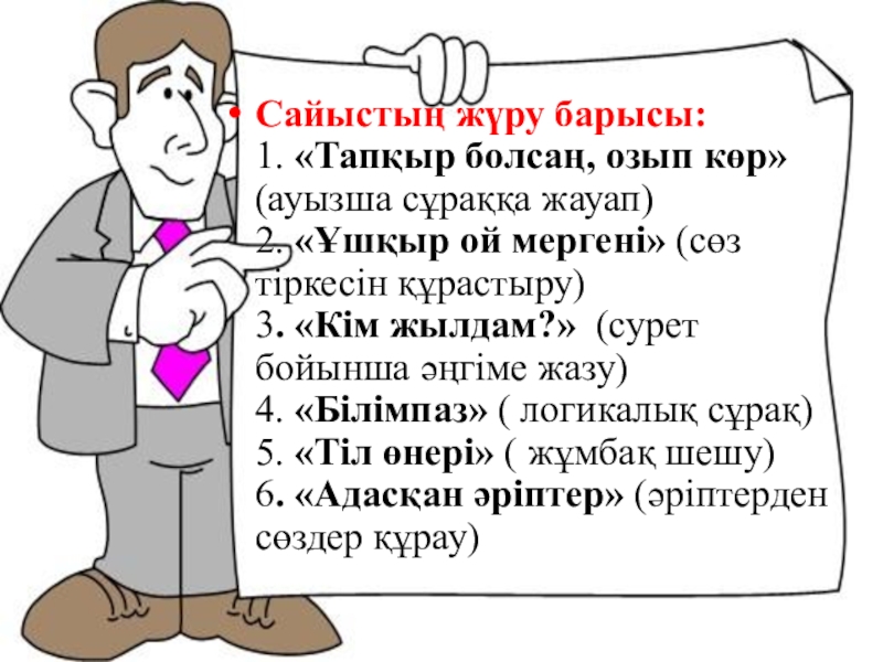 (ауызша сұраққа жауап) 2. «Ұшқыр ой мергені» (сөз тіркесін құрастыру) 3. «Кім жылдам?» (сурет бойынша әңгіме жазу) 4. «Білімпаз» ( логикалық сұрақ) 5. «Тіл өнері» ( жұмбақ шешу) 6. «Адасқан әріптер» (әріптерден сөздер құрау)
