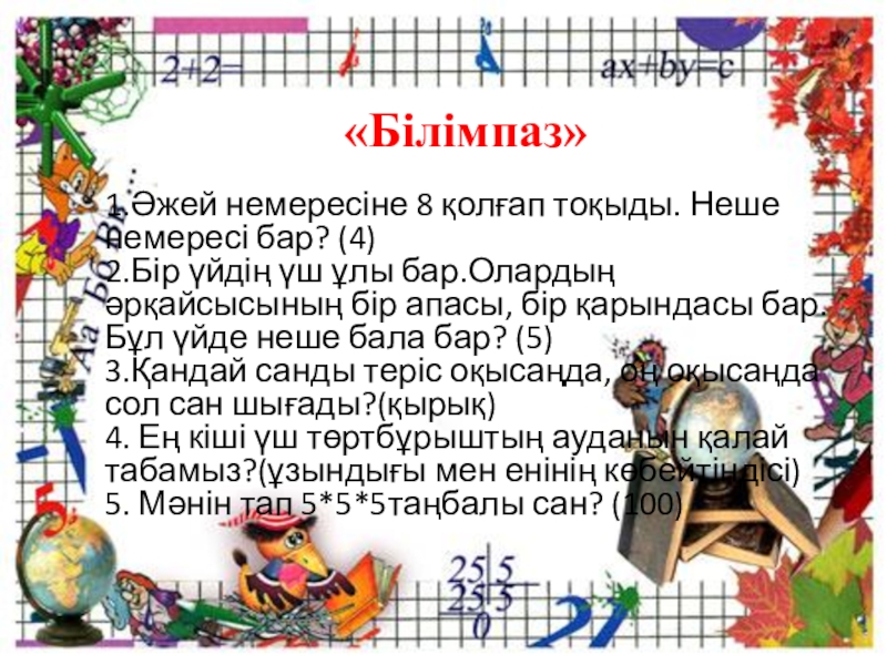 ұлы бар.Олардың әрқайсысының бір апасы, бір қарындасы бар.Бұл үйде неше бала бар? (5) 3.Қандай санды теріс оқысаңда, оң оқысаңда сол сан шығады?(қырық) 4. Ең кіші үш төртбұрыштың ауданын қалай табамыз?(ұзындығы мен енінің көбейтіндісі)