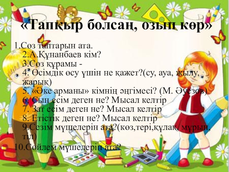 «Тапқыр болсаң, озып көр»1.Сөз таптарын ата. 2.А.Құнанбаев кім? 3.Сөз құрамы - 4. Өсімдік өсу үшін не қажет?(су,