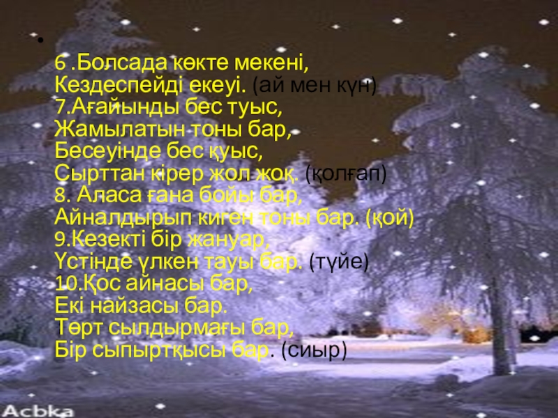 6 .Болсада көкте мекені, Кездеспейді екеуі. (ай мен күн) 7.Ағайынды бес туыс, Жамылатын тоны бар, Бесеуінде