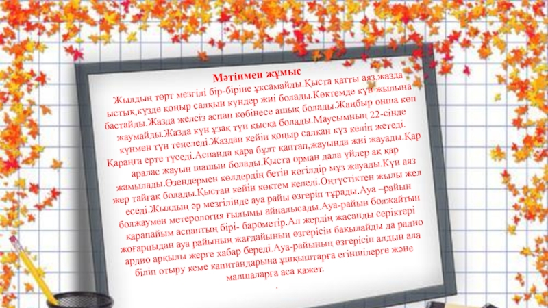 күндер жиі болады.Көктемде күн жылына бастайды.Жазда желсіз аспан көбінесе ашық болады.Жаңбыр онша көп жаумайды.Жазда күн ұзақ түн қысқа болады.Маусымның 22-сінде күнмен түн теңеледі.Жаздан кейін қоңыр салқан күз келіп жетеді.Қараңға ерте түседі.Аспанда қара бұлт қаптап,жауында жиі жауады.Қар аралас жауын шашын болады.Қыста орман дала үйлер ақ қар жамылады.Өзендермен көлдердің бетін көгілдір мұз жауады.Күн аяз жер тайғақ болады.Қыстан кейін көктем келеді.Оңтүстіктен жылы жел еседі.Жылдың әр мезгілінде ауа райы өзгеріп тұрады.Ауа –райын болжаумен метерология ғылымы айналысады.Ауа-райын болжайтын қарапайым аспаптың бірі- барометір.Ал жердің жасанды серіктері жоғарпыдан ауа райының жағдайының өзгерісін бақылайды да радио ардио арқылы жерге хабар береді.Ауа-райының өзгерісін алдын ала біліп отыру кеме капитандарына ұшқыштарға егіншілерге және малшаларға аса қажет.