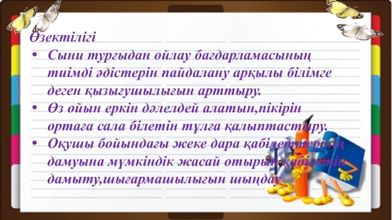 Өз ойын еркін дәлелдей алатын,пікірін ортаға сала білетін тұлға қалыптастыру.