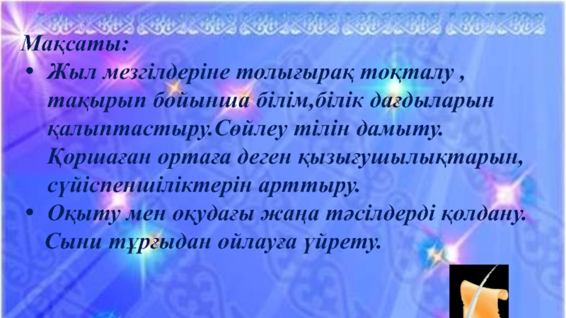 Жыл мезгілдеріне толығырақ тоқталу , тақырып бойынша білім,білік дағдыларын қалыптастыру.Сөйлеу тілін