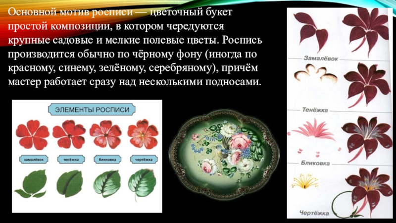 Слайд 8Основной мотив росписи — цветочный букет простой композиции, в котором чередуются крупные