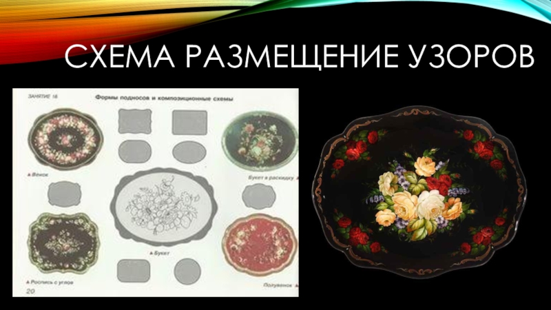 - уборка краёв подноса (украшение борта подноса, состоящее из геометрических или растительных узоров. Уборка может быть скромной, а может соперничать с роскошными старинными рамами для картин. Без уборки изделие выглядит незаконченным).