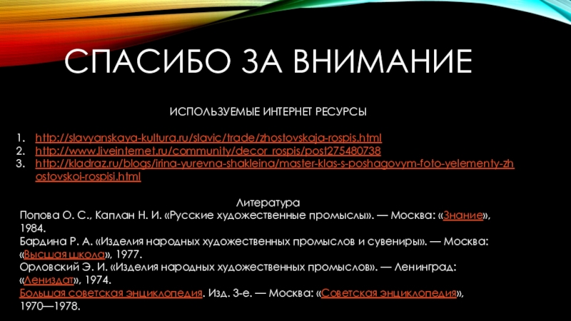Орловский Э. И. «Изделия народных художественных промыслов». — Ленинград: «Лениздат», 1974.