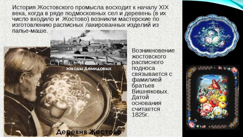 откупившихся на волю крестьян — братьев Вишняковых. В 1928 году несколько артелей, образованных на базе мастерских после революции, объединились в одну — «Металлоподнос» в деревне Жостово, которая в дальнейшем (1960 г.) была преобразована в Жостовскую фабрику декоративной росписи.