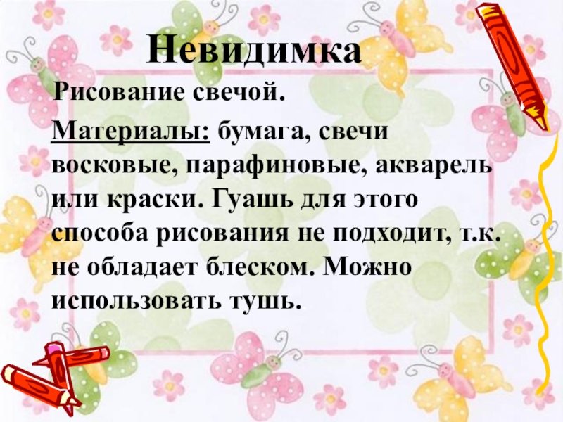 Материалы: бумага, свечи восковые, парафиновые, акварель или