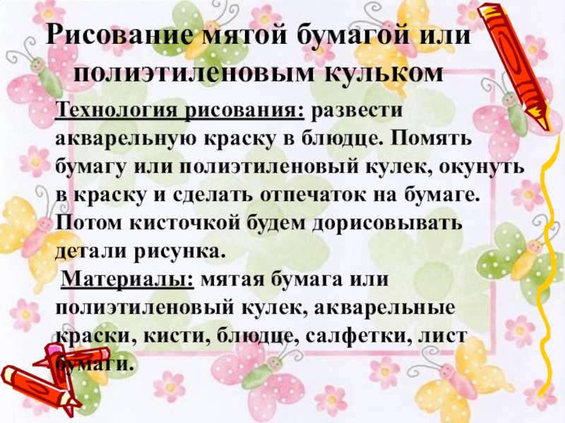 Материалы: мятая бумага или полиэтиленовый кулек, акварельные краски, кисти, блюдце, салфетки, лист бумаги.