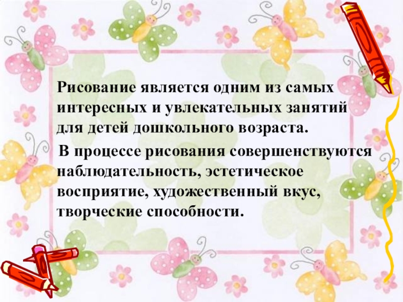 В процессе рисования совершенствуются наблюдательность, эстетическое восприятие, художественный вкус, творческие способности.