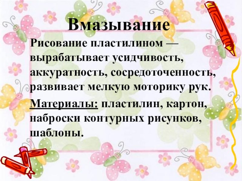 Рисование пластилином — вырабатывает усидчивость, аккуратность, сосредоточенность, развивает мелкую