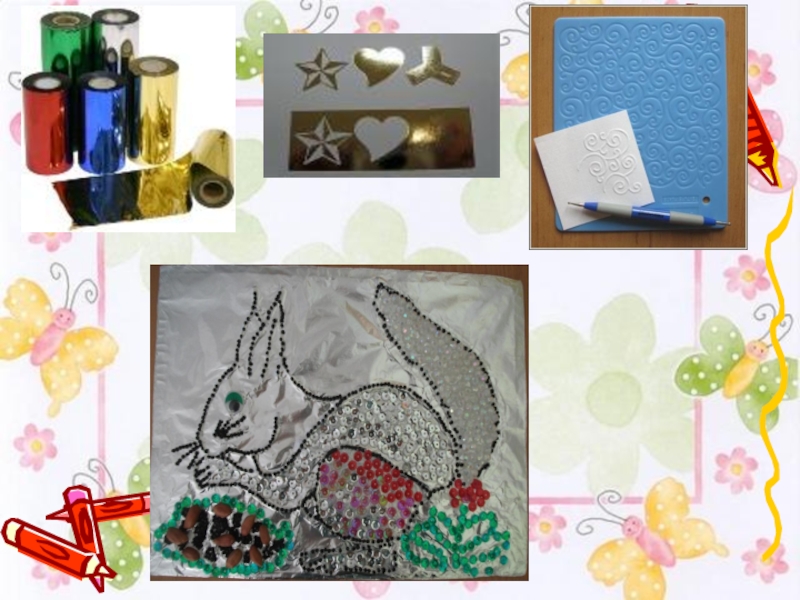 один – два предмета. Получается чеканка. На фольге в точности отпечатывается то, что было на верхнем листе.
