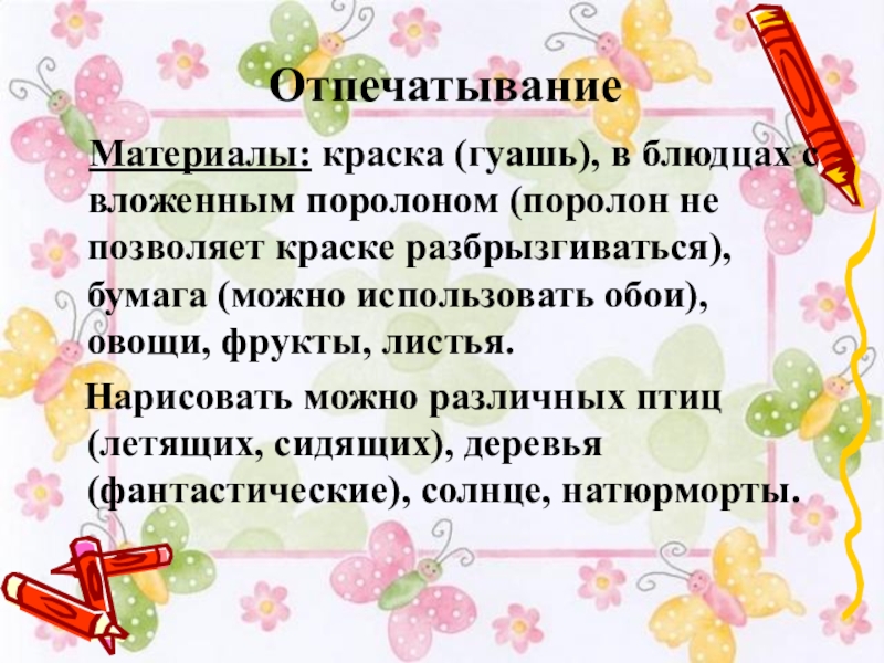 вложенным поролоном (поролон не позволяет краске разбрызгиваться), бумага (можно использовать обои), овощи, фрукты, листья.