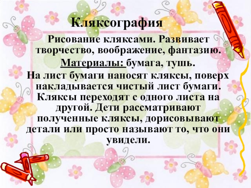 На лист бумаги наносят кляксы, поверх накладывается чистый лист бумаги. Кляксы переходят с одного листа на другой. Дети рассматривают полученные кляксы, дорисовывают детали или просто называют то, что они увидели.