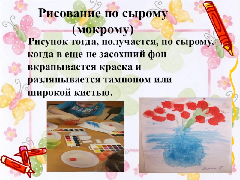 Слайд 13Рисование по сырому (мокрому)
