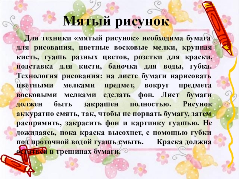 цветные восковые мелки, крупная кисть, гуашь разных цветов, розетки для краски, подставка для кисти, баночка для воды, губка. Технология рисования: на листе бумаги нарисовать цветными мелками предмет, вокруг предмета восковыми мелками сделать фон. Лист бумаги должен быть закрашен полностью. Рисунок аккуратно смять, так, чтобы не порвать бумагу, затем распрямить, закрасить фон и картинку гуашью. Не дожидаясь, пока краска высохнет, с помощью губки под проточной водой гуашь смыть. Краска должна остаться в трещинах бумаги.