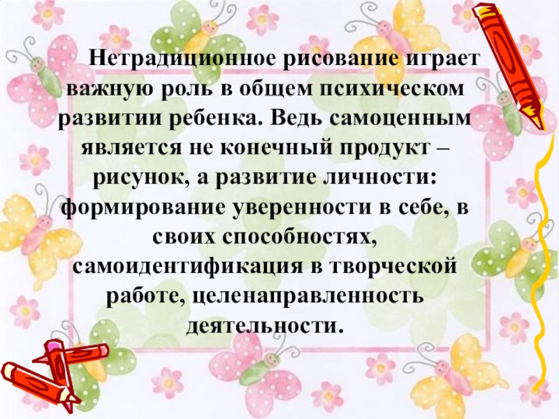 психическом развитии ребенка. Ведь самоценным является не конечный продукт – рисунок, а развитие личности: формирование уверенности в себе, в своих способностях, самоидентификация в творческой работе, целенаправленность деятельности.