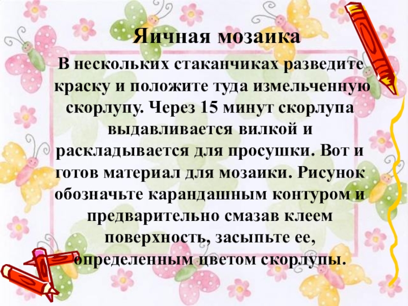 измельченную скорлупу. Через 15 минут скорлупа выдавливается вилкой и раскладывается для просушки. Вот и готов материал для мозаики. Рисунок обозначьте карандашным контуром и предварительно смазав клеем поверхность, засыпьте ее, определенным цветом скорлупы.