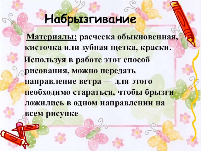 в работе этот способ рисования, можно передать направление ветра — для этого необходимо стараться, чтобы брызги ложились в одном направлении на всем рисунке.