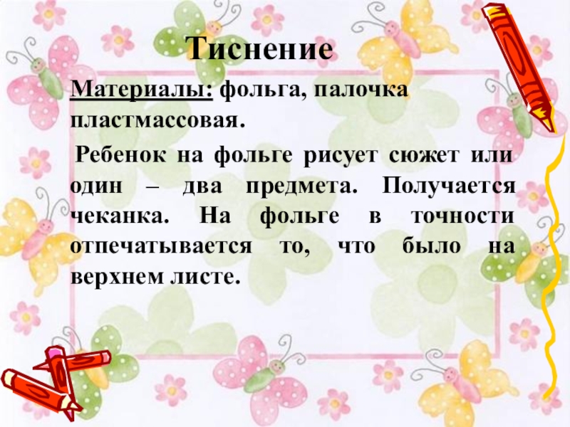 один – два предмета. Получается чеканка. На фольге в точности отпечатывается то, что было на верхнем листе.