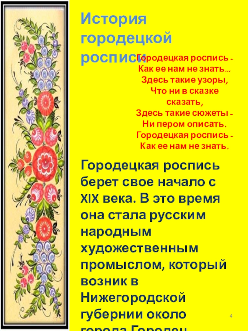 Городецкая роспись берет свое начало с XIX века. В это время она стала русским народным художественным промыслом, который возник в Нижегородской губернии около города Городец.