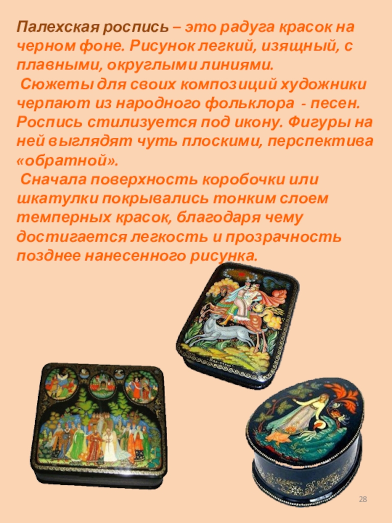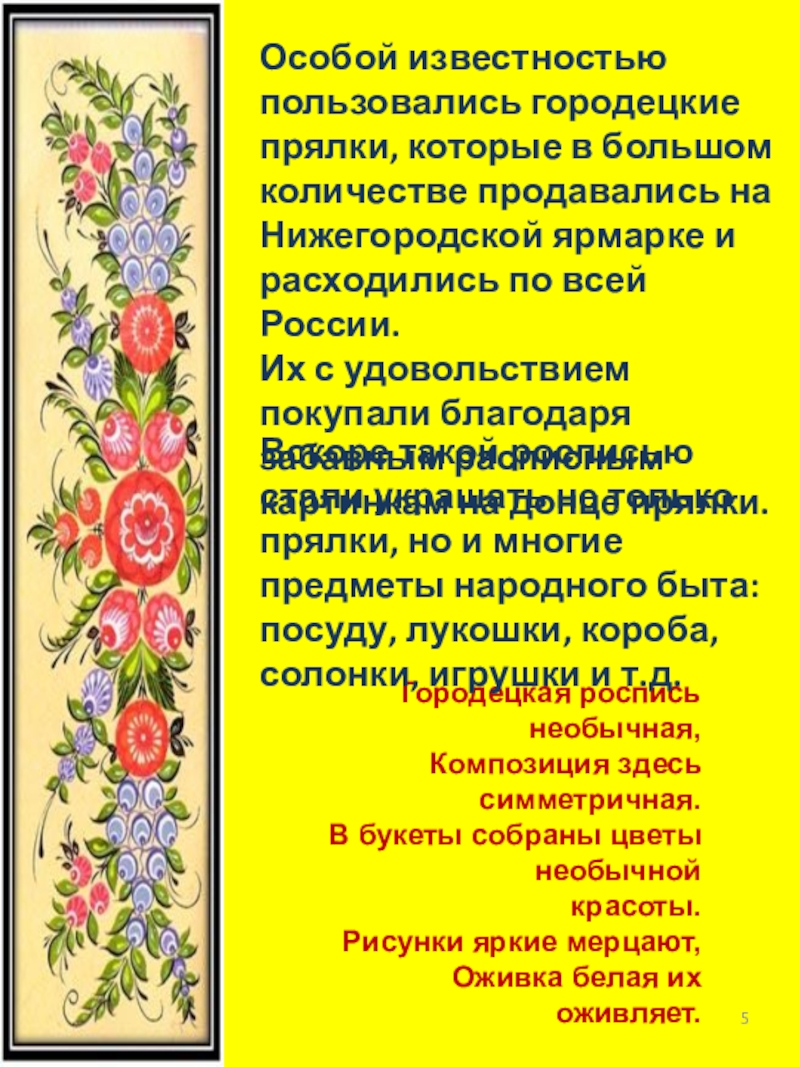 Вскоре такой росписью стали украшать не только прялки, но и многие предметы народного быта: посуду, лукошки, короба, солонки, игрушки и т.д.