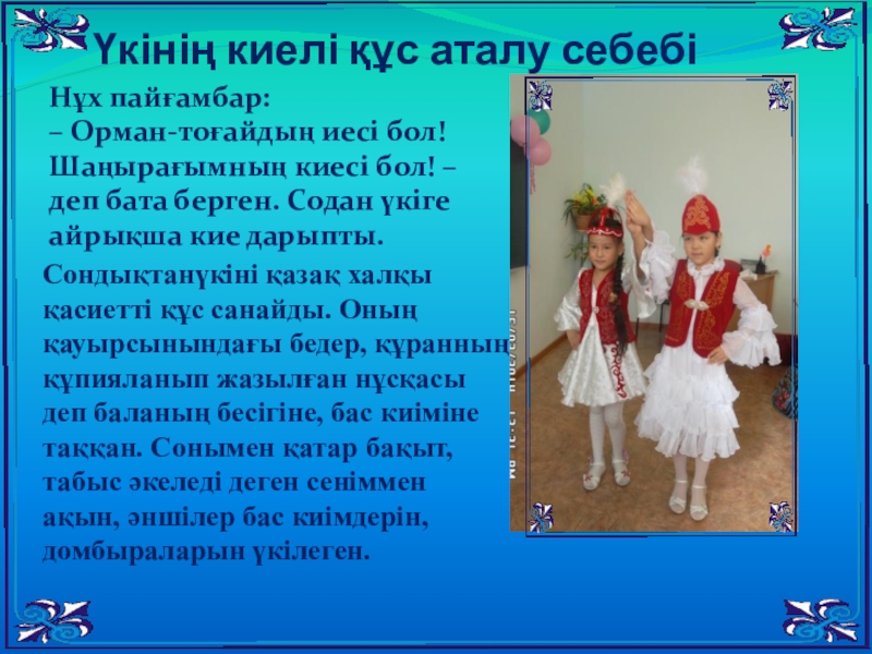 Сондықтанүкіні қазақ халқы қасиетті құс санайды. Оның қауырсынындағы бедер, құранның құпияланып жазылған нұсқасы деп баланың бесігіне, бас киіміне таққан. Сонымен қатар бақыт, табыс әкеледі деген сеніммен ақын, әншілер бас киімдерін, домбыраларын үкілеген.