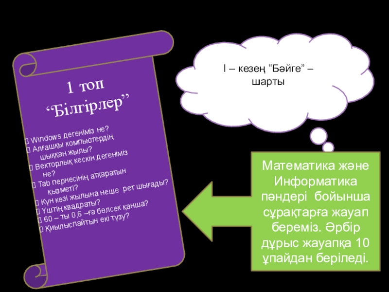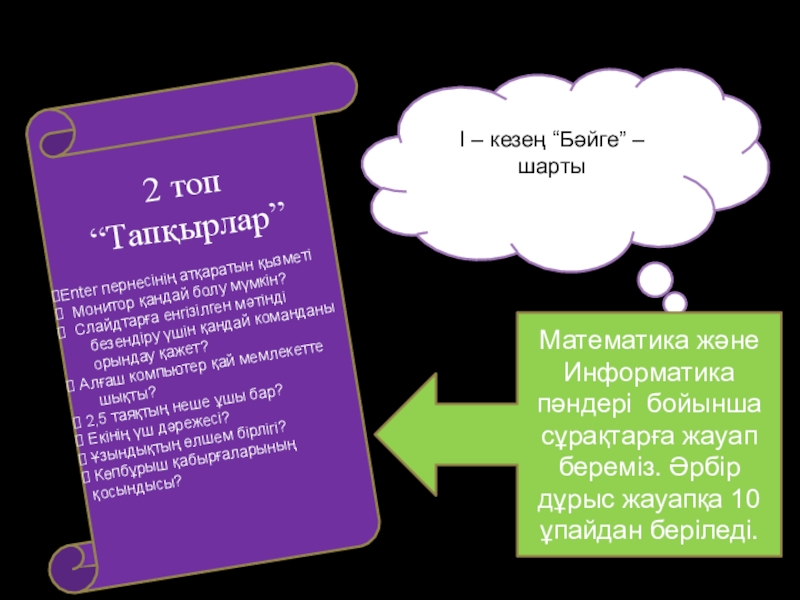 сұрақтарға жауап береміз. Әрбір дұрыс жауапқа 10 ұпайдан беріледі.