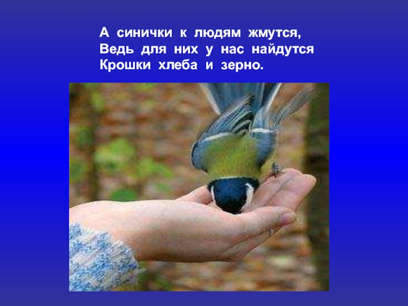 А синички к людям жмутся,Ведь для них у нас найдутсяКрошки хлеба и зерно.