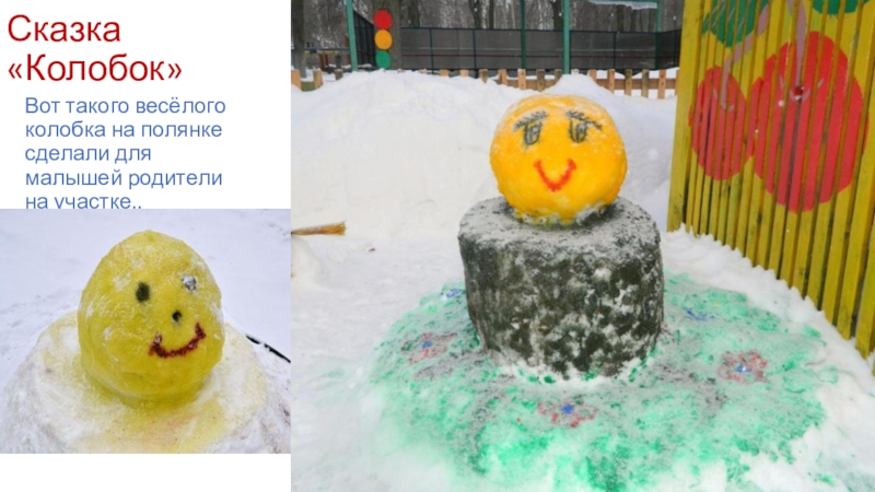 Сказка «Колобок»Вот такого весёлого колобка на полянке сделали для малышей родители на участке..