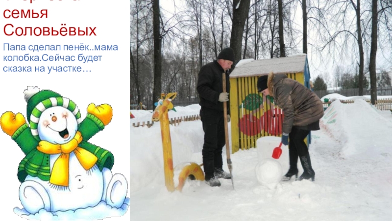 Слайд 2А всё начиналось так : папы расчистили снег на участке,сгребли его