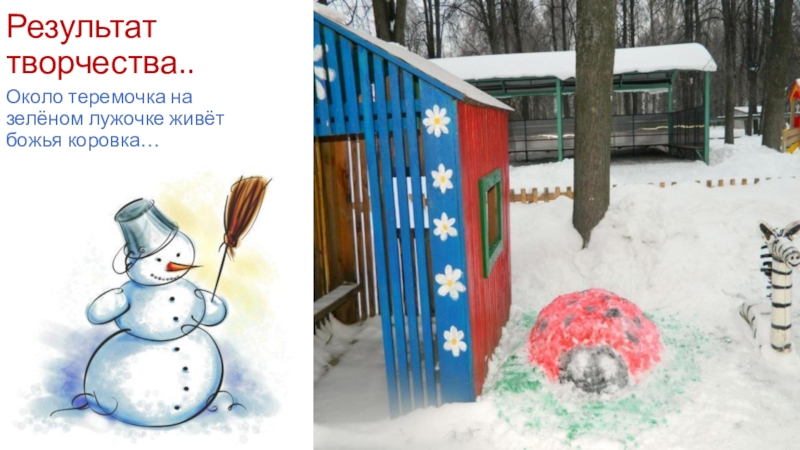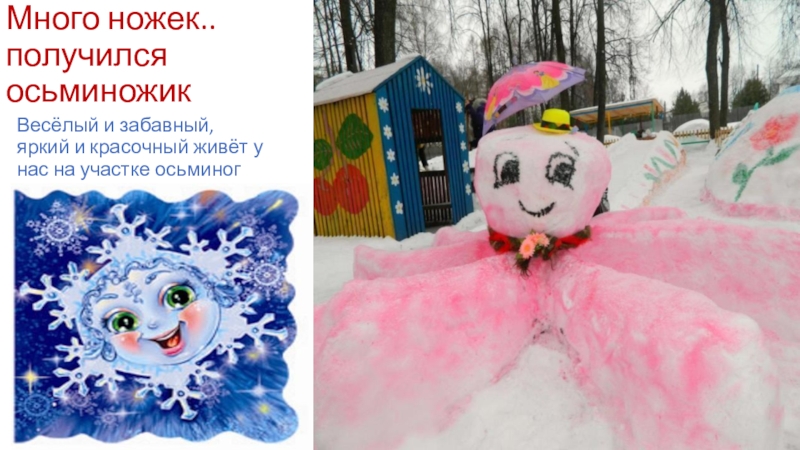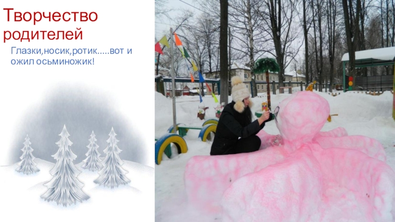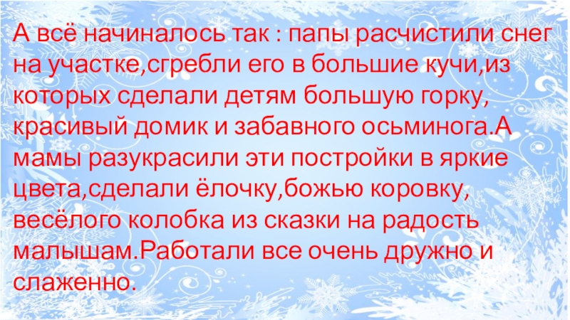 А всё начиналось так : папы расчистили снег на участке,сгребли его в большие кучи,из которых сделали детям большую горку,красивый домик и забавного осьминога.А мамы разукрасили эти постройки в яркие цвета,сделали ёлочку,божью коровку, весёлого колобка из сказки
