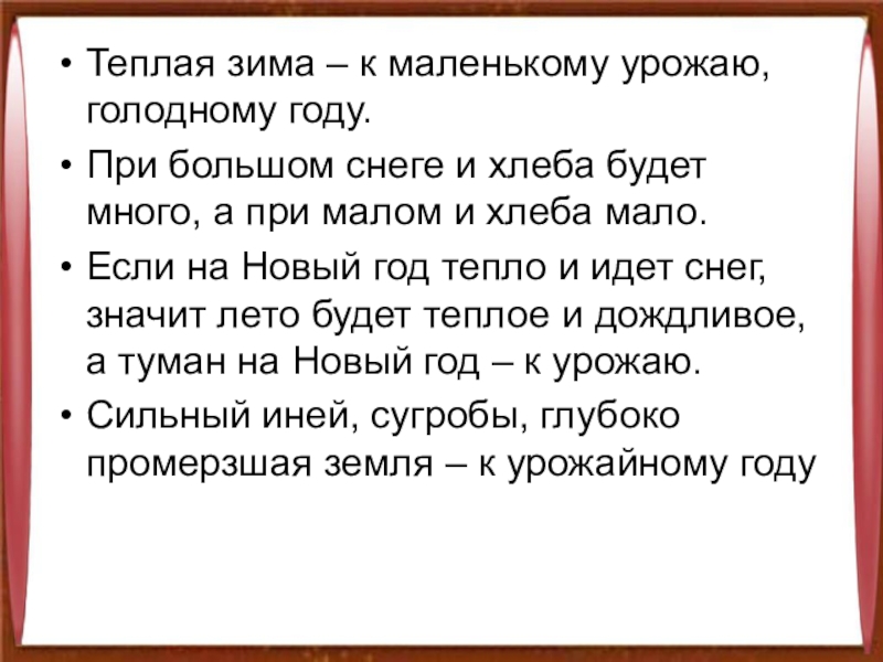 Слайд 5Теплая зима – к маленькому урожаю, голодному году.
