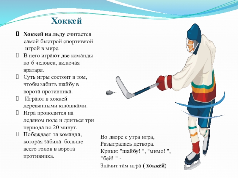 Суть игры состоит в том, чтобы забить шайбу в ворота противника.