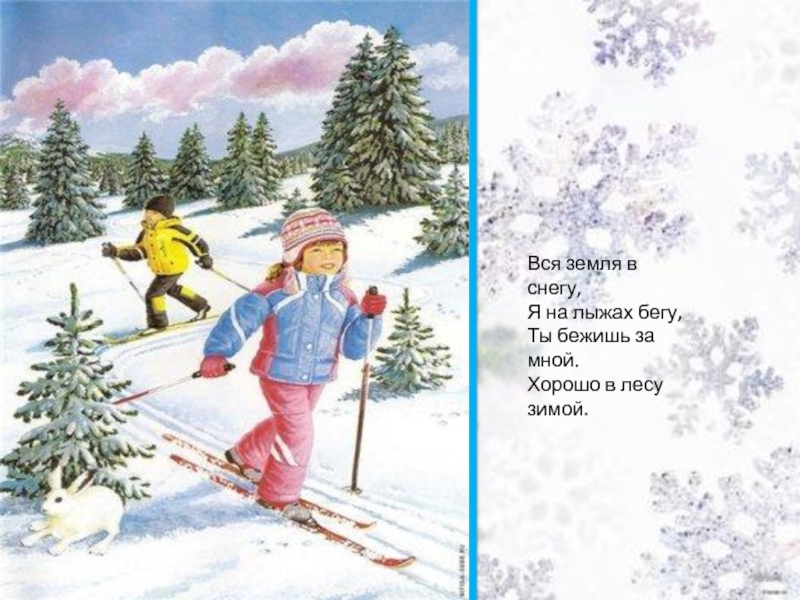 Слайд 3Вся земля в снегу,  Я на лыжах бегу,  Ты бежишь за мной.  Хорошо в