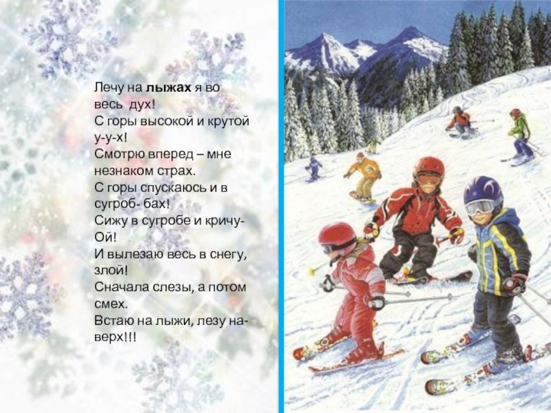 Лечу на лыжах я во весь  дух! С горы высокой и крутой у-у-х! Смотрю вперед – мне незнаком страх. С