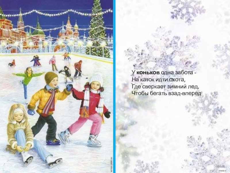Слайд 4У коньков одна забота - На каток идти охота, Где сверкает зимний лед, Чтобы бегать взад-вперед