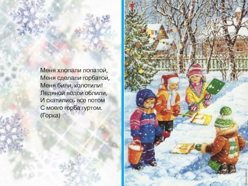 Слайд 5Меня хлопали лопатой,  Меня сделали горбатой,  Меня били, колотили!  Ледяной водой облили,  И скатились все