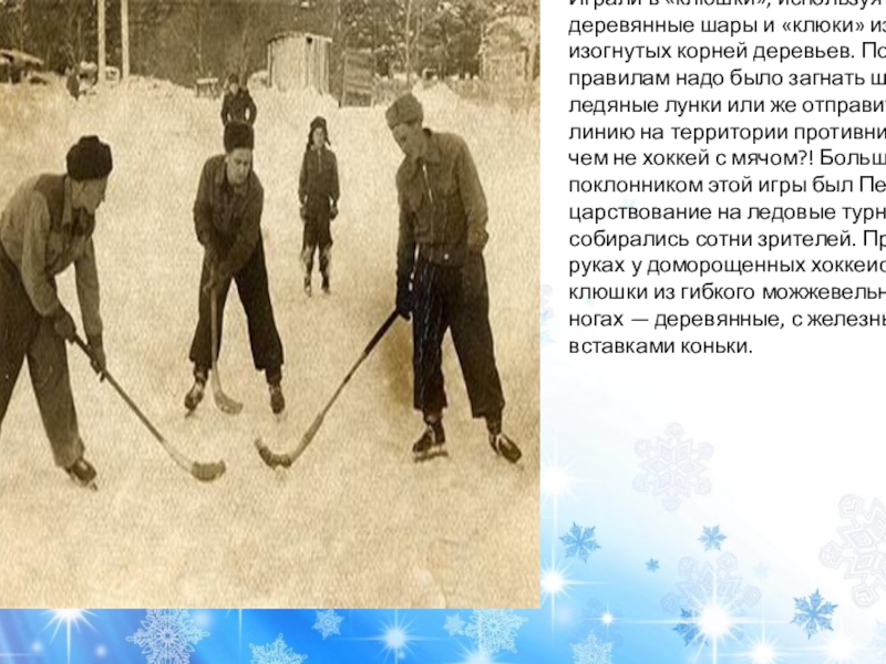 деревьев. По правилам надо было загнать шар в ледяные лунки или же отправить его за линию на территории противника. Ну, чем не хоккей с мячом?! Большим поклонником этой игры был Петр I. В его царствование на ледовые турниры собирались сотни зрителей. При этом в руках у доморощенных хоккеистов были клюшки из гибкого можжевельника, а на ногах — деревянные, с железными вставками коньки.