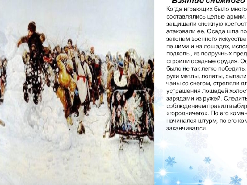снежную крепость, другие атаковали ее. Осада шла по всем законам военного искусства: в бой шли пешими и на лошадях, использовали подкопы, из подручных предметов строили осадные орудия. Осаждаемых было не так легко победить: они брали в руки метлы, лопаты, сыпали на врагов чаны со снегом, стреляли для устрашения лошадей холостыми зарядами из ружей. Следить за соблюдением правил выбирали «городничего». По его команде начинался штурм, по его команде и заканчивался.