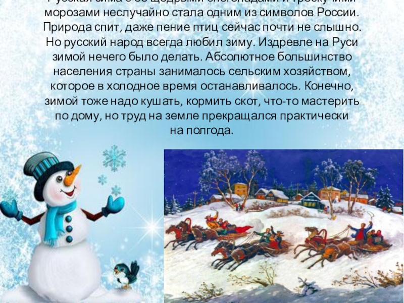 Слайд 3Русская зима с её щедрыми снегопадами и трескучими морозами неслучайно стала