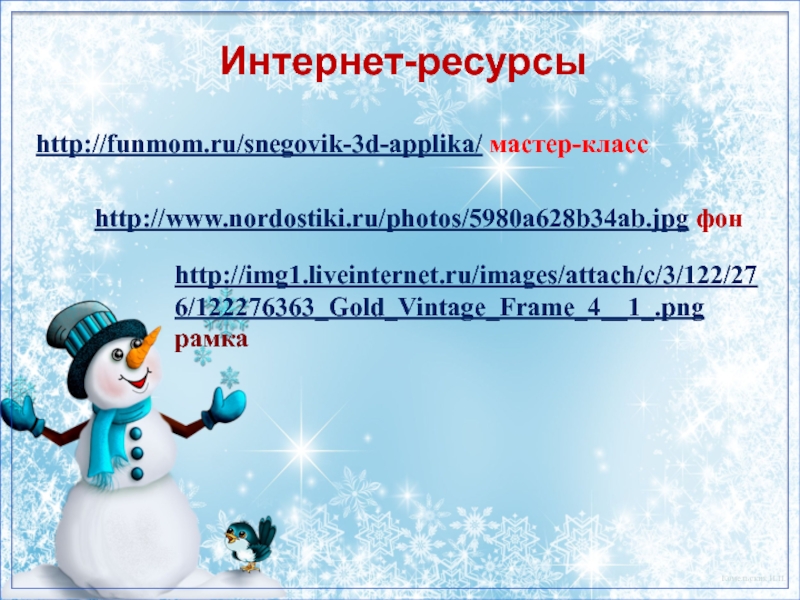 http://funmom.ru/snegovik-3d-applika/ мастер-классИнтернет-ресурсыhttp://www.nordostiki.ru/photos/5980a628b34ab.jpg фонhttp://img1.liveinternet.ru/images/attach/c/3/122/276/122276363_Gold_Vintage_Frame_4__1_.png рамка
