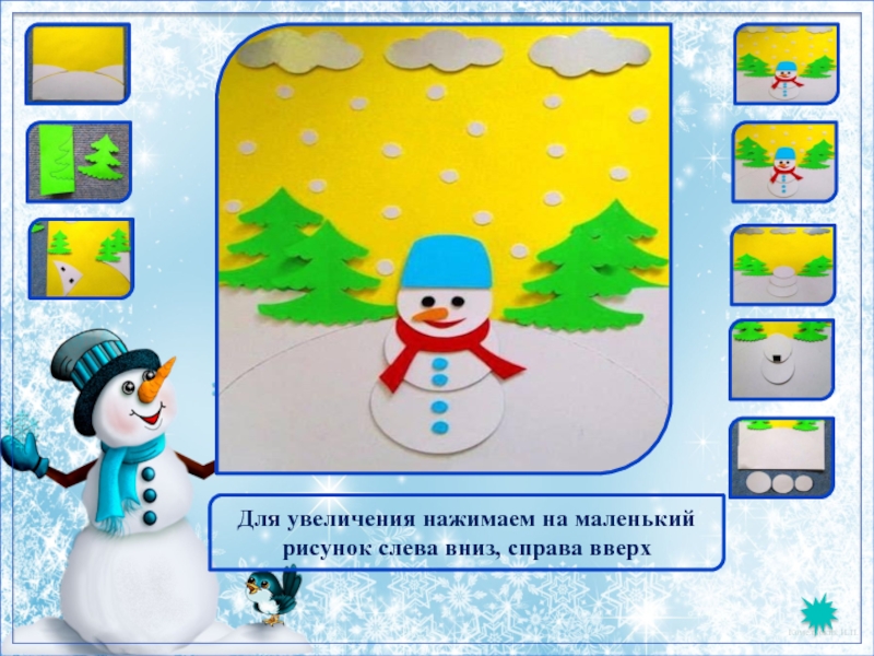 Слайд 3Для увеличения нажимаем на маленький рисунок слева вниз, справа вверх