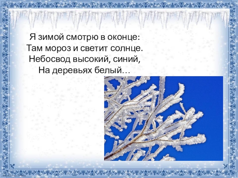Я зимой смотрю в оконце:Там мороз и светит солнце.Небосвод высокий, синий,На деревьях белый…