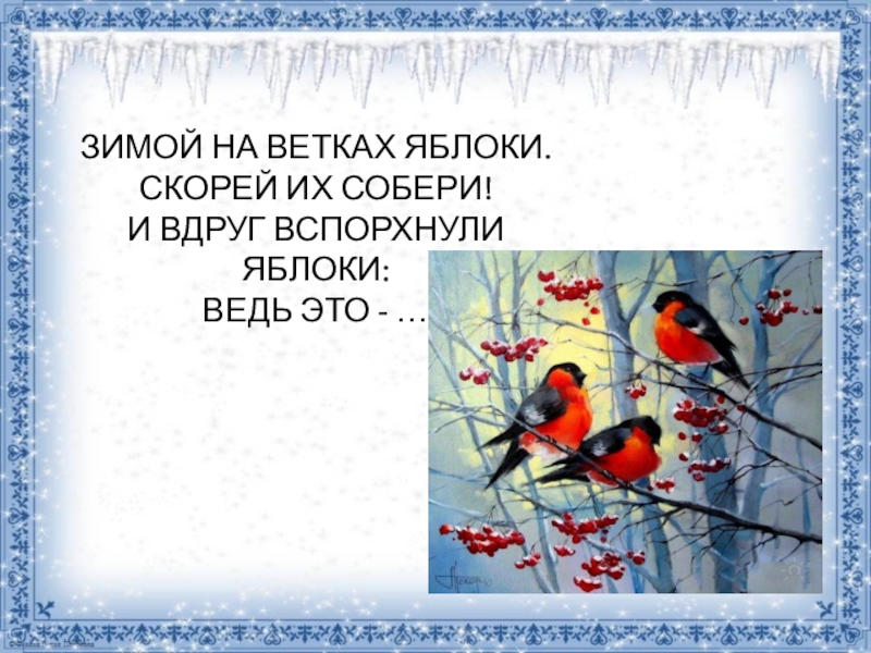 Слайд 10Зимой на ветках яблоки. Скорей их собери! И вдруг вспорхнули яблоки: Ведь это -