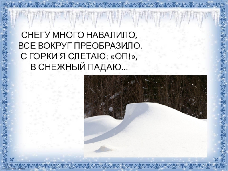 Слайд 9Снегу много навалило, Все вокруг преобразило. С горки я слетаю: «Оп!», В снежный падаю...