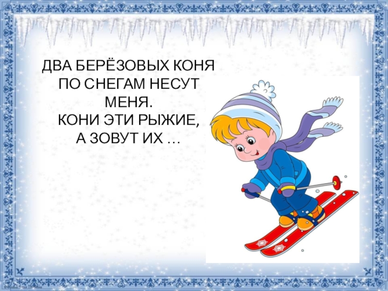 Два берёзовых коня По снегам несут меня. Кони эти рыжие, А зовут их …