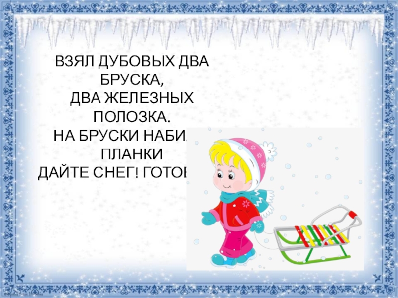 Взял дубовых два бруска, Два железных полозка. На бруски набил я планки Дайте снег! Готовы …
