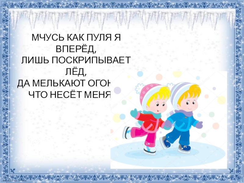 Слайд 12Мчусь как пуля я вперёд, Лишь поскрипывает лёд, Да мелькают огоньки. Что несёт меня?...